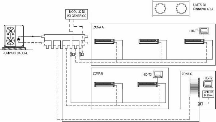 Эта конфигурация представляет второй уровень комфорта. По отношению к типологии предыдущей установки присутствует установка приточного воздуха (ELFOFresh), которая гарантирует непрерывный воздухообмен. Регулировка влажности в помещении производится термостатом типа «температура – влажность», подключенным непосредственно к фанкойлу.